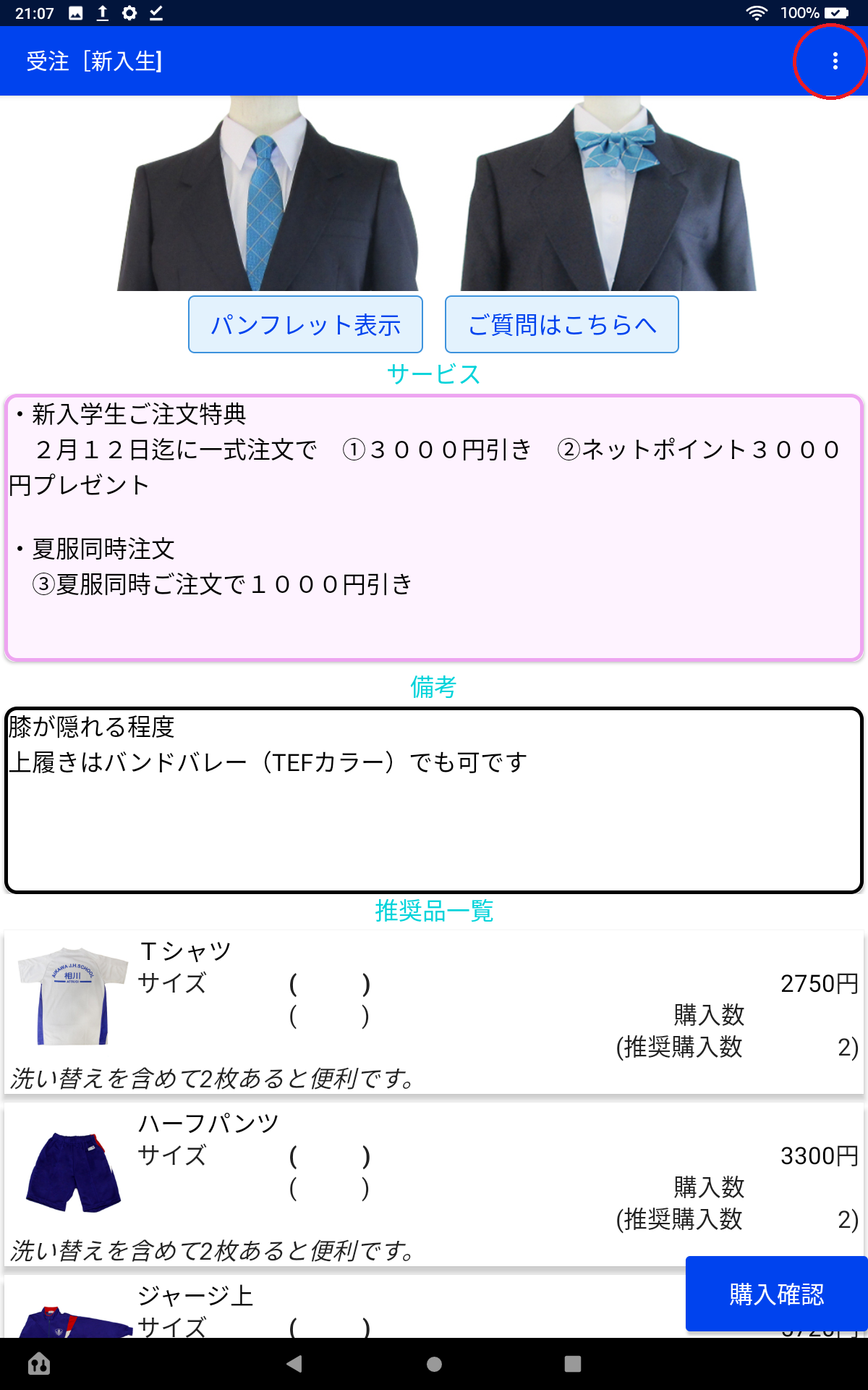 まず、注文画面中の右上の︙をタップすると