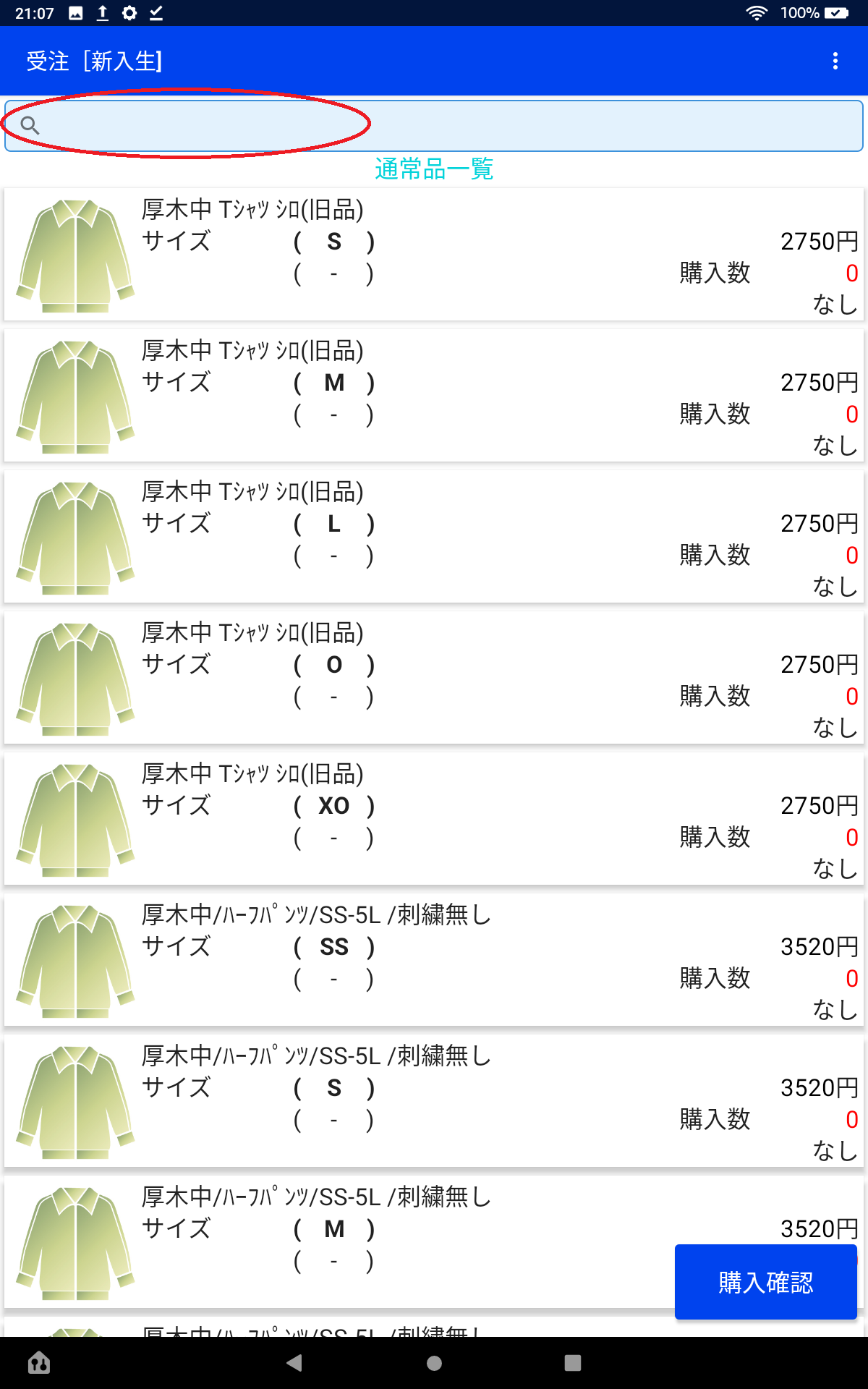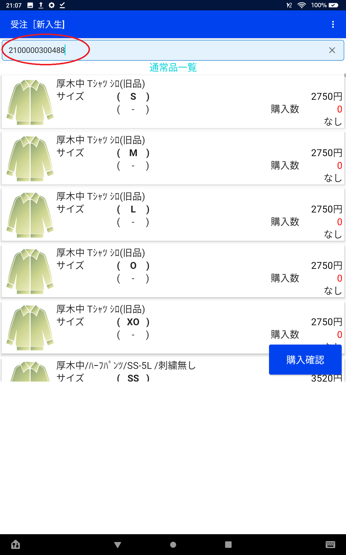 該当する商品が現れますので注文を入力し、入力後、最初と同様に右上の︙をタップし、【推奨品】に戻すか、もう注文が無い場合はそのまま購入確認画面にすすみます。